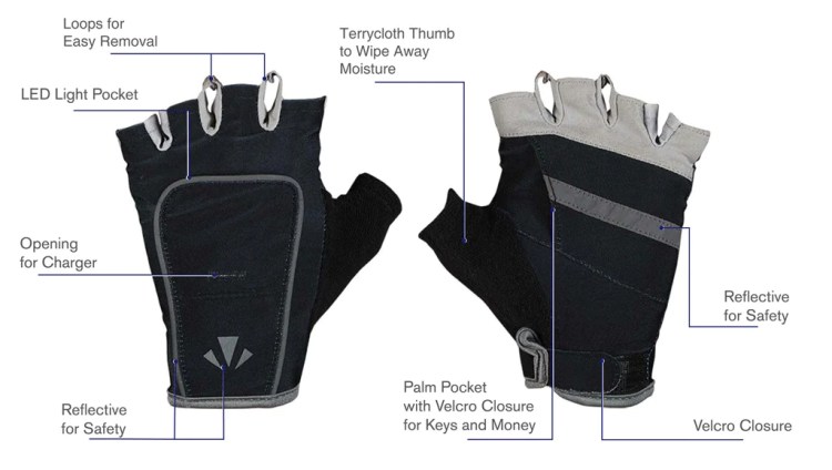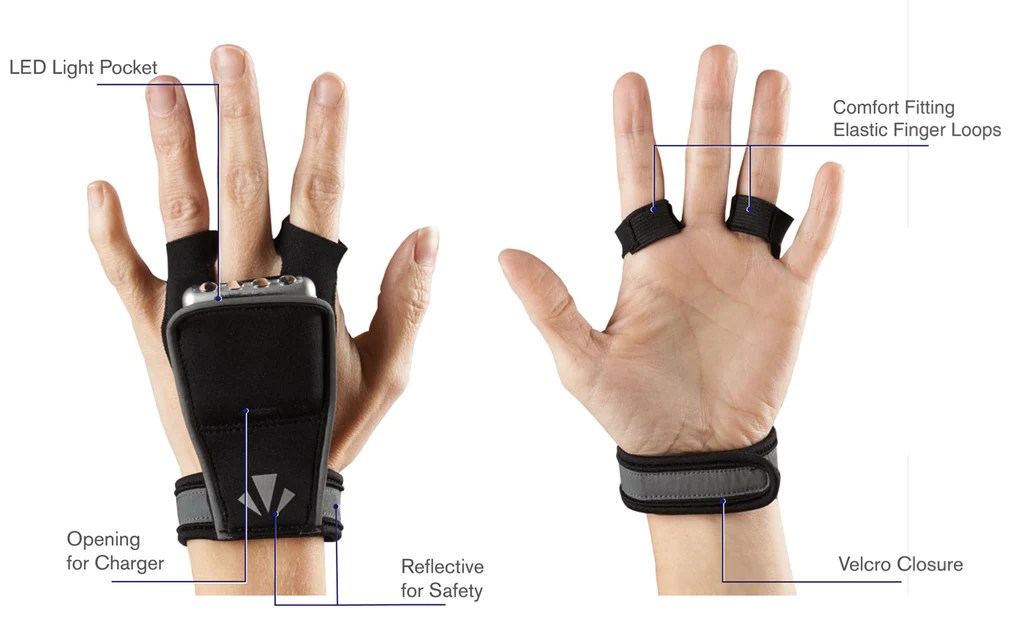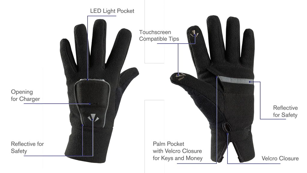 MangataLites & RunLites are hands-free, wearable safety lights. They’re perfect for any type of nighttime or low-light activity, from walking the dog, navigating dark basements, running and cycling. The MangataLites & RunLites LEDs provides a 270-degree radial arc of light up to 40 feet ahead to increase the wearer’s visibility. The gloves have reflective strips and accents to help the pedestrian be seen.